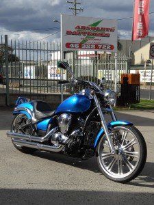 The beautiful thing about custom bikes is that the owner can put their own personal touch on it. Mick has done a nice job on this very cool bike. With its Candy Plasma Blue paint, its lower stance and the big 240 x 18″ rear wheel, this one stands out in the crowd. The new exhaust gives a note that stirs the blood. Nice bike Mick.